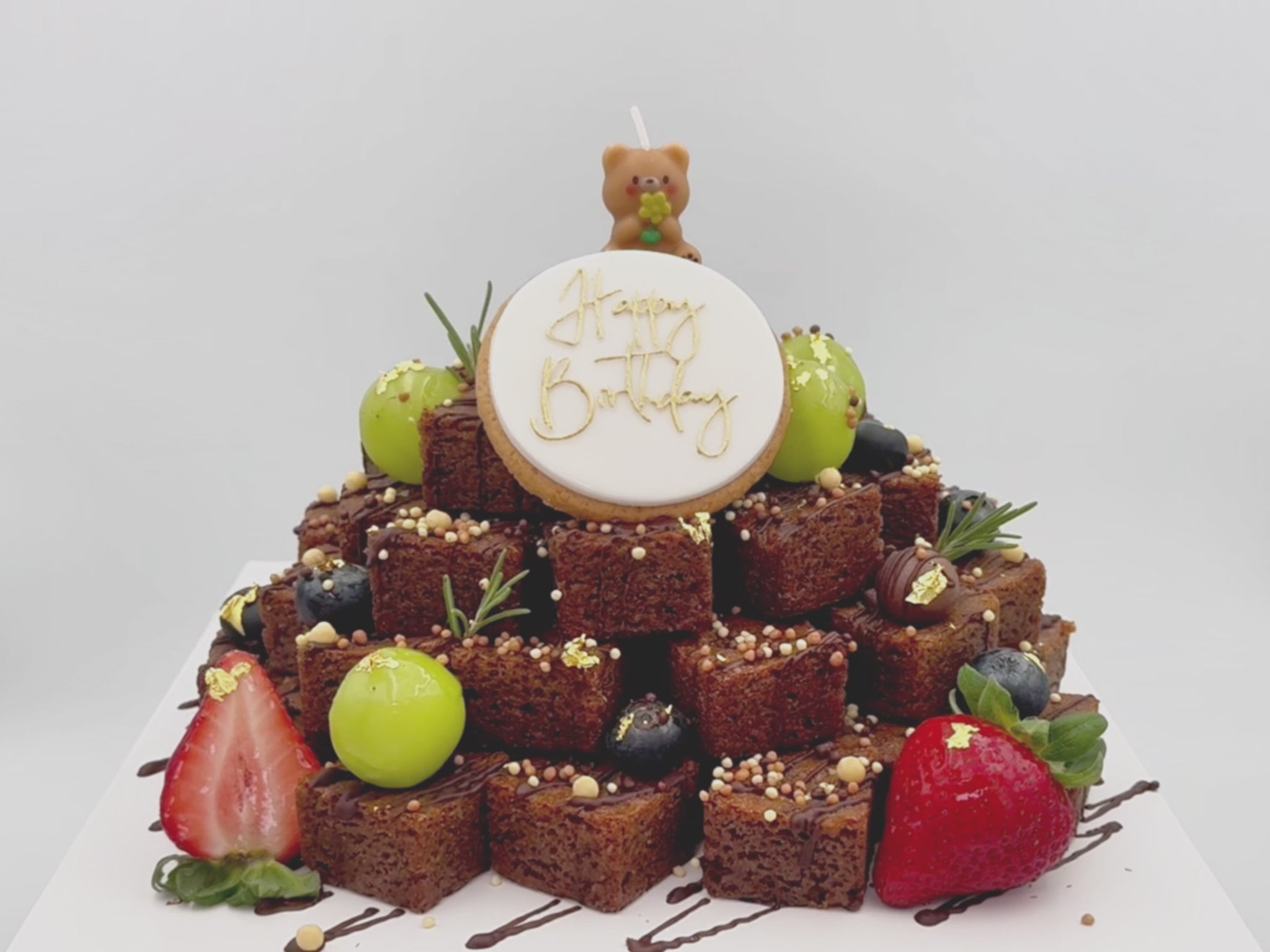 Rich and bold brownie cubes, aged for 24 hours and made with French butter, muscovado sugar, Valrhona chocolate, and a hint of Maldon sea salt, are stacked into a beautiful, edible tower. Perfect for birthdays or casual celebrations, the celebrant can blow out the candle, and the cake can be served directly on the cake board. Guests simply pluck a brownie from the stack to enjoy. No slicing needed!